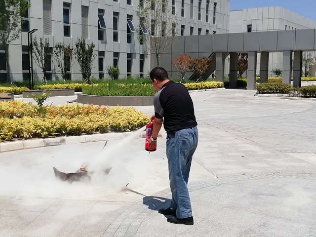 随后,与会人员在园区内参加了消防应急和逃生演练。青岛都市消防培训中心张智博向大家讲解了常用干粉灭火器的使用方法和注意事项,并作了灭火示范,与会人员亲身学习和体验了如何使用干粉灭火器灭火。